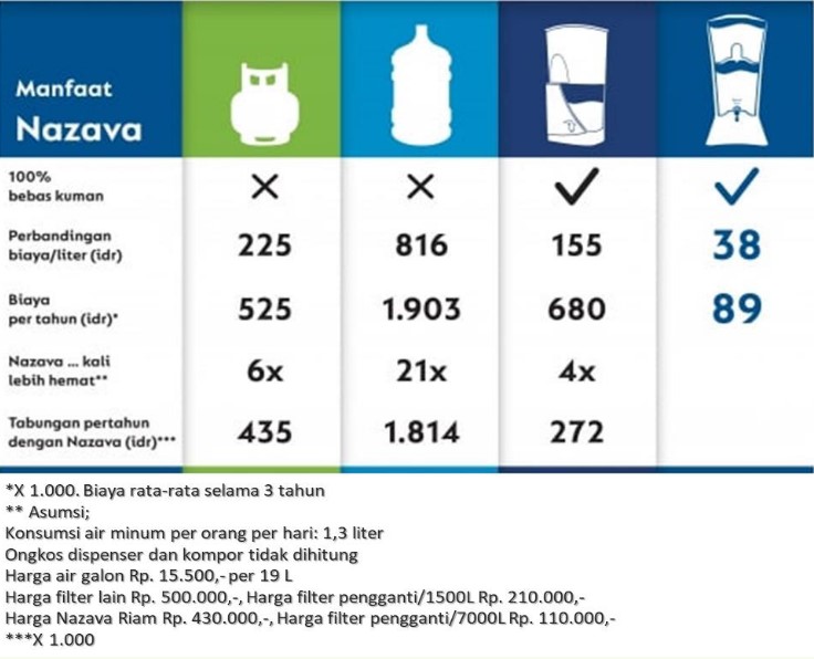Jika Anda masih ragu, yuk kita bandingkan Nazava dengan cara-cara konvensional dan produk lainnya. Bila diperhatikan dari gambar di atas, maka dapat dikatakan Nazava 6x lebih hemat jika dibandingkan dengan merebus air sendiri, 21x lebih hemat dibandingkan air galon, dan 4x lebih hemat dibandingkan produk yang hampir mirip dengan Nazava. Hemat disini bisa diartikan dari persoalan harga, ketahanan, dan kualitas. Sementara untuk faktor keamanan atau terbebas dari bakteri, dua cara konvensional sudah lebih dulu tereliminasi karena memang tidak dapat menjamin bakteri benar-benar musnah.